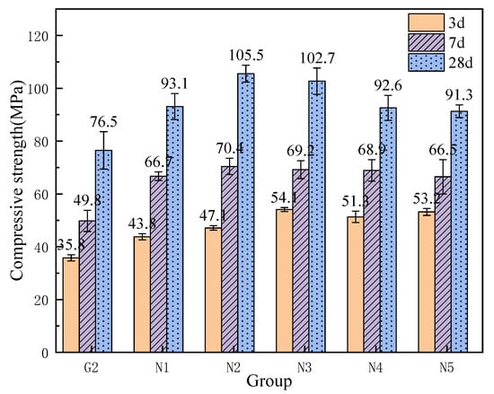 As shown in Figure 7, the incorporation of nanosilica (NS) effectively enhances the 3-day compressive strength of the grout, exhibiting a trend of initial increase followed by a decline. The strength improvement in groups N1 and N2 is less pronounced compared to groups N3 through N5. Notably, group N3, with an NS content of 0.6%, achieved the highest 3-day compressive strength of 54.1 MPa, approximately 18.3 MPa higher than the control group G2. This suggests that a relatively higher NS dosage significantly promotes early strength development of the grout. The 7-day compressive strength shows minimal variation among groups N1 to N5, indicating that NS dosage has a limited influence on the 7-day strength. However, compared to group G2, NS addition notably improves the 7-day compressive strength, with group N2 (0.4% NS) reaching a maximum value of 70.4 MPa. Furthermore, Figure 8 clearly shows that the 28-day compressive strength follows a pattern of increasing initially and then decreasing. Both groups N2 and N3 exhibit compressive strengths exceeding 100 MPa, at 105.5 MPa and 102.7 MPa, respectively. The optimal group N2 surpasses the control group G2 by approximately 29 MPa, representing an improvement of about 37.9%. Groups N1, N4, and N5 also maintain compressive strengths around 92 MPa, indicating that NS incorporation effectively enhances the 28-day compressive strength of the grout, with 0.4% identified as the relatively optimal dosage.