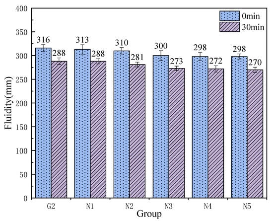 As shown in Figure 8, with increasing nanosilica (NS) content, both the initial flowability and the flowability after 30 min show a continuous decline compared to the control group G2, with values consistently lower than those of G2. For groups N3, N4, and N5, the initial flowability fluctuates around 300 mm, with the lowest value of 298 mm observed in group N4. Nonetheless, the initial and 30-min flowability values of all groups meet the grout specification standards. Considering the grout’s mechanical properties comprehensively, although the flowability values of groups N1 and N2 are lower than those of group G2, they still largely comply with the specification requirements. Furthermore, the 7-day and 28-day compressive strengths of group N2 exceed those of group N1. Therefore, group N2, with an NS content of 0.4%, is identified as the optimal mix proportion.