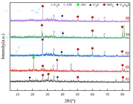 As shown in Figure 9, compared with other groups, the N2 group generated more hydration products such as C2S, C3S, and AFt, with higher peak values for the hydration products. Among them, the peak value of the calcium aluminate crystal was obvious, indicating that when the NS content was 0.4%, the calcium aluminate crystal was complete and had good crystallinity.