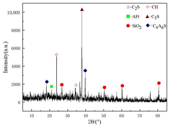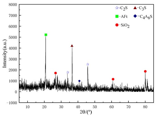 XRD analysis results, as shown in Figure 9, indicate that the primary hydration products of the cement-based grout are dicalcium silicate (C2S), tricalcium silicate (C3S), ettringite (AFt), calcium hydroxide (CH), and calcium sulfoaluminate (C4A6S). A broad peak observed between 20° and 45° corresponds to the formation of calcium silicate hydrate (C-S-H) gel and ettringite crystals during the hydration reaction. The formation of these hydration products contributes to the enhancement in the specimen’s flexural and compressive strengths.