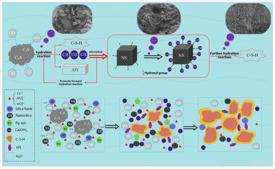 With the incorporation of nanosilica (NS), the hydration behavior of the cement-based grout is significantly affected. Due to abundant hydroxyl groups on the NS surface, which are polar and highly hydrophilic, NS strongly adsorbs calcium hydroxide (CH) produced during cement hydration. This adsorption reduces the concentration of CH in the pore solution, disrupting the hydration equilibrium and promoting further hydration of cement minerals. Moreover, NS reacts with CH in a secondary pozzolanic reaction, generating additional C-S-H gel. These newly formed C-S-H gels fill the pores in the cement matrix, further enhancing the grout’s density and mechanical strength. A schematic diagram of the hydration mechanism is shown in Figure 11.