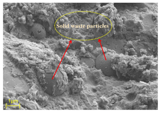 Based on the SEM images in Figure 13 and Figure 14, it can be observed that the hydration of the cement-based grout produces rod-like and needle-like ettringite (AFt) crystals, reticulated C-S-H gel, plate-like calcium hydroxide (CH) crystals, as well as partially reacted fly ash and silica fume particles. CH is a typical hydration product of cement; however, excessive CH can consume free Ca2+ ions in the paste, thereby inhibiting the formation of C-S-H gel. This limitation can lead to a decrease in grout strength, adversely affecting the overall mechanical performance to some extent.