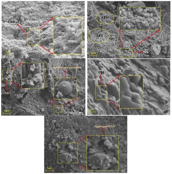 Comparing different dosages of nanosilica (NS), Figure 14a shows no obvious unreacted solid waste particles, with strong overall material connectivity. Clustered C-S-H gel is well bonded to the cement matrix, and abundant reticulated C-S-H gel interconnects with needle-like AFt crystals. In Figure 14b, numerous fibrous C-S-H gel and needle-rod-shaped AFt crystals clearly bond the surrounding material, forming a structure akin to reinforced concrete. Crystalline AFt fills pores at gel interfaces within the matrix, improving internal pore structure and resulting in higher strength in the hardened cement-based grout. Figure 14c reveals many fine NS particles adsorbed on the surfaces of silica fume, fly ash, and CH, accelerating the hydration process; however, some unreacted spherical silica fume or fly ash particles are still visible. Overall, group N2 exhibits slightly higher compressive strength than group N3 at the macroscopic level. Figure 14d clearly displays hexagonal plate-like or layered CH crystals with attached NS particles, but excessive CH can negatively impact the long-term performance of the grout. In Figure 14e, substantial NS agglomeration is observed, attributed to enhanced van der Waals forces at the nanoscale when NS content is excessive. As particle spacing decreases, these forces increase sharply, promoting aggregation. Macroscopically, this leads to reduced flowability, increased viscosity, greater water demand, and ultimately a decrease in compressive strength.