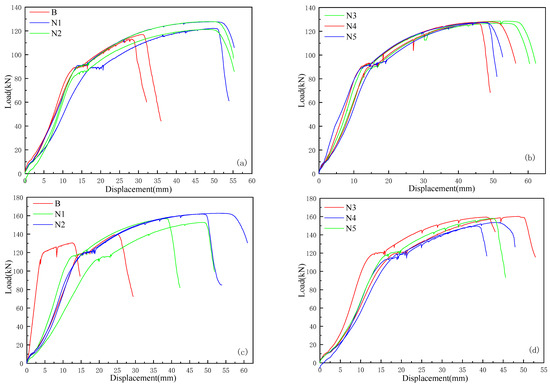 Load–displacement curves were plotted based on the experimental data. In these figures, curve B represents the half-grouted sleeve group without nanosilica (NS) addition, corresponding to the control group G2 from preliminary tests. Curves N1 through N5 represent half-grouted sleeve groups with NS contents of 0.2%, 0.4%, 0.6%, 0.8%, and 1.0%, respectively. As shown in Figure 16a,b, for grout sleeves with a diameter of 16 mm, the load–displacement curves of groups N1–N5 are generally similar. In contrast, the load for group B declines when the displacement is less than 30 mm, indicating premature load loss due to rebar pullout before reaching the standard tensile strength. Figure 16c,d shows the load–displacement behavior for 18 mm grout sleeves. Due to differing failure modes among the groups, the curves vary considerably; however, their initial ascending trends are nearly identical. Notably, groups N3 and N4 exhibit significant fluctuations during the strengthening phase, likely caused by progressive damage within the grout under loading, which leads to rebar slip inside the sleeve and eventual pullout.