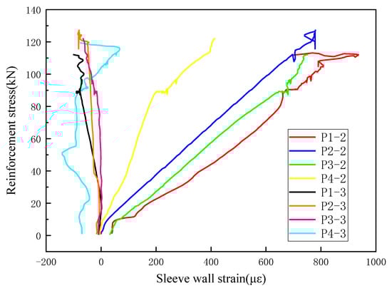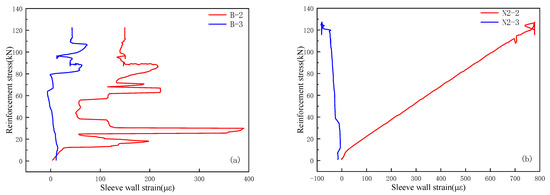 Figure 18a,b present data from the control group and group N2, respectively. As shown in Figure 18a, the sleeve strain in the control group exhibits irregular fluctuations, with strain gauge No. 2 displaying particularly large variations. This phenomenon is attributed to poor bonding between the grout and the sleeve wall inside the specimen. During progressive loading, the grout gradually debonds from the inner sleeve surface, resulting in persistent fluctuations in the sleeve wall strain. In contrast, Figure 18b shows an approximately linear relationship between sleeve wall strain and rebar stress in group N2, further confirming that the nanosilica (NS)-modified solid waste grout bonds well with the sleeve wall, indicating strong compatibility between the grout and the sleeve.