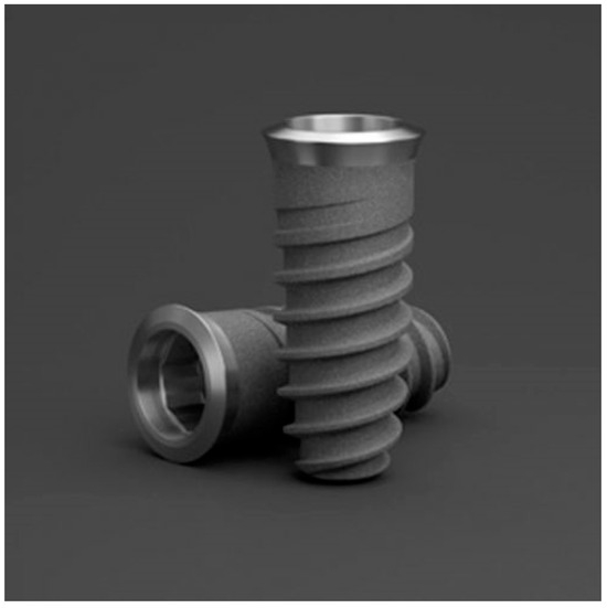 Essential dental implant (Klockner Medical Group, Madrid, Spain). The dental implants were 3.8 mm in diameter and 12.0 mm in length, with a pitch of 1.0 mm and a neck length of 1.5 mm. The dental implants were made with commercially pure titanium, grade 3.