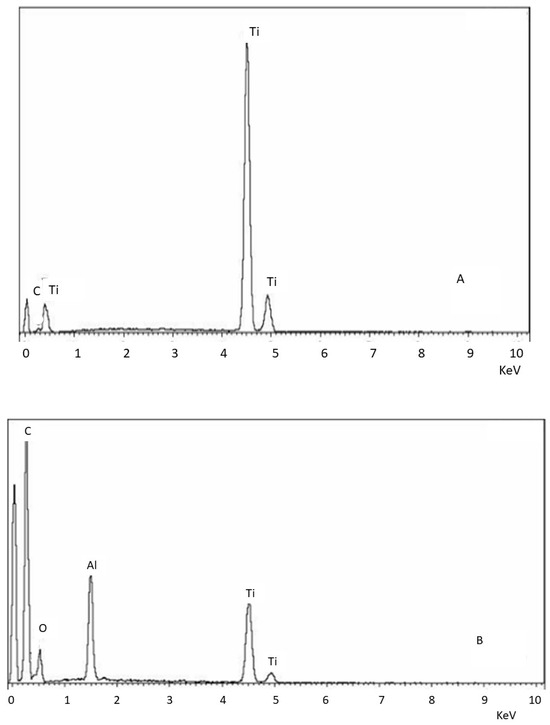 EDS microanalysis of the different surfaces. (A) Control. (B) Surface treated with sand blasting without cleaning. (C) Surface treated with sand blasting with severe ultrasounds cleaning.