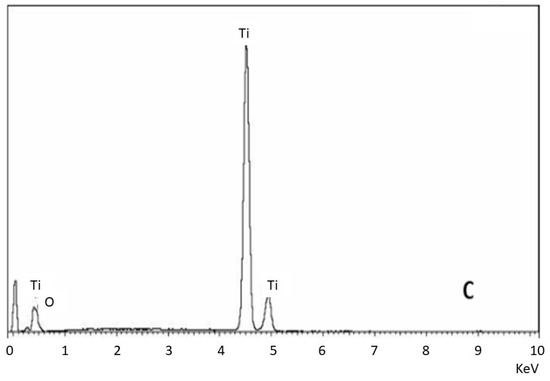 Residual stresses were measured with a diffractometer incorporating a Bragg–Bentano configuration. The measurements were taken for the family of planes (213), which diffracts at 2θ = 139.5°. The elastic constants of Ti at the direction of this family of planes are EC = (E/1+ν)(213) = 90.3 (1.4) GPa. Eleven Ψ angles, zero and five positive- and five negative-angles were evaluated. The position of the peaks was adjusted with a pseudo-Voigt function using appropriate software (WinplotR, free access online, Compact version 2016), and then converted to interplanar distances (dΨ) using Bragg’s equation. Production of the d Ψ vs. sen2Ψ graphs and the calculation of the slope of the linear regression (A) were carried out with appropriate software (Origin, Microcal, version 5.3 code 137684 Amherst, MA, USA). The residual stress is as follows: σ = EC(1/d0)A, where d0 is the interplanar distance for Ψ = 0° [67,68].