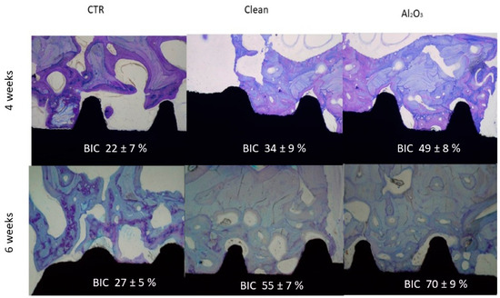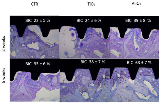 Histological sections of control (CTR), TiO2-blasted, and Al2O3-blasted implants at 2 and 6 weeks (adapted from References [45,49]).