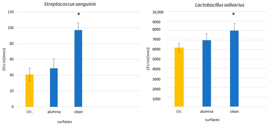 CFU quantification on titanium surfaces with and without alumina. Asterisks indicate statistically significant differences (p < 0.05). (Adapted from Reference [18]).