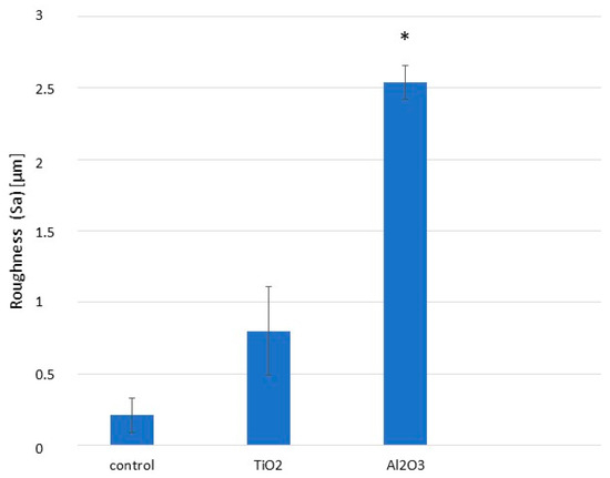 Surface roughness parameter (Sa) for machined, Al2O3-blasted, and TiO2-blasted titanium surfaces. Asterisk indicates statistically significant differences (p < 0.05). (Adapted from Reference [45]).