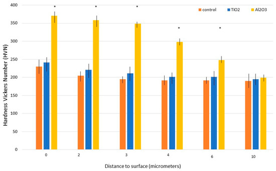 Microhardness variation with depth for machined, Al2O3-blasted, and TiO2-blasted titanium samples. Asterisks indicate statistically significant differences (p < 0.05). (Adapted from Reference [45]).
