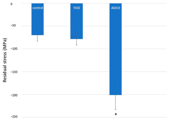 Compressive residual stresses for different titanium surface treatments. Asterisk indicates statistically significant differences (p < 0.05).