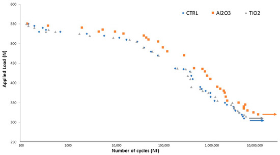 Fatigue testing results revealed that implants blasted with Al2O3 exhibited a longer fatigue life than those treated with TiO2 or that were left untreated (CTR), as illustrated in Figure 8. Differences between the Al2O3, TiO2, and CTR groups were statistically significant (p < 0.005). Under identical cyclic loading conditions, the number of cycles to fracture was consistently higher for Al2O3-treated implants.