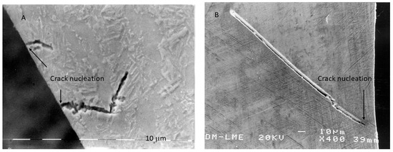 Fracture surface exhibiting crack nucleation from the surface for an implant that was subjected to TiO2 abrasive (A) and crack nucleation at a crack nucleation distance of 7 to 10 μm from the surface for the case of abrasion with Al2O3 particles (B). (Adapted from Reference [49]).