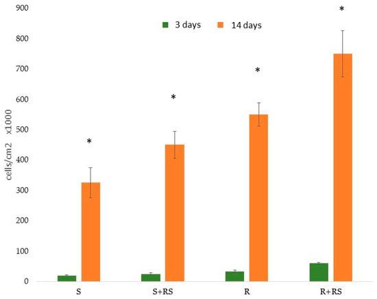 Proliferation of Saos-2 cells on the surfaces studied. After 3 days and 14 days of incubation. Asterisk indicates statistically significant differences (p < 0.05). (Adapted from Reference [69]).