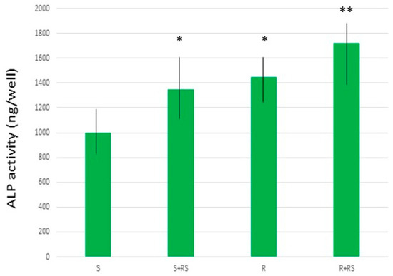 ALP production by Saos-2 cells on different surfaces. An asterisk (*) indicates a statistically significant difference compared with values without an asterisk. A double asterisk (**) indicates a statistically significant difference compared with values without an asterisk and those with a single asterisk. Statistically significant differences were considered at p < 0.05. (Adapted from Reference [69]).