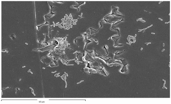Bacterial adhesion to titanium surfaces involves several stages: bacterial migration, reversible and irreversible adhesion, specific interactions, and biofilm formation. Surface morphology and roughness, along with physicochemical factors like hydrophobicity and surface free energy, play crucial roles in these processes [16,17]. Residual alumina may also affect bacterial viability due to its oxidative properties. As is shown in Figure 4, bacterial counts for two strains related to peri-implantitis were lower on alumina-containing surfaces compared to cleaned ones.