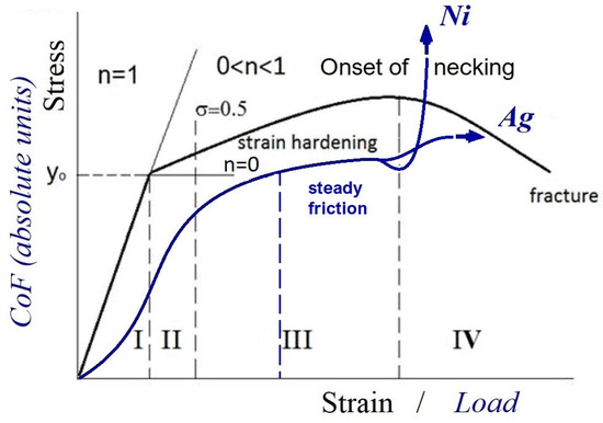 It is expected that the transition to instability can be achieved when ταap ≥ τb. However, the average hardness of Ag after friction in the unstable region is H = 800 MPa, and thus, the applied shear stress = 800/3√3 ≈ 155 MPa. Nevertheless, if we assume that the hardness is a macroscale parameter and apply, in this case, the coefficient of similitude (K ≈ 5–10) [117], τcr can vary in the range τcr ≈ 775–1550 MPa. When N = N*/2, the maximum shear flow stress (τcr) and critical strain (εcr) can be calculated as in [92]: