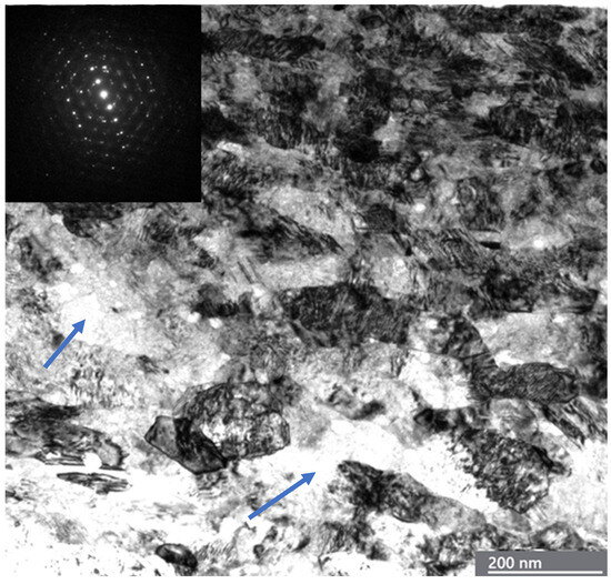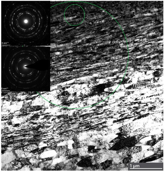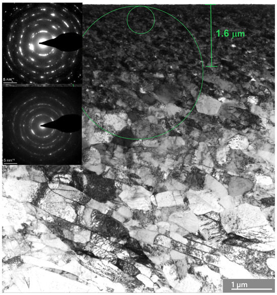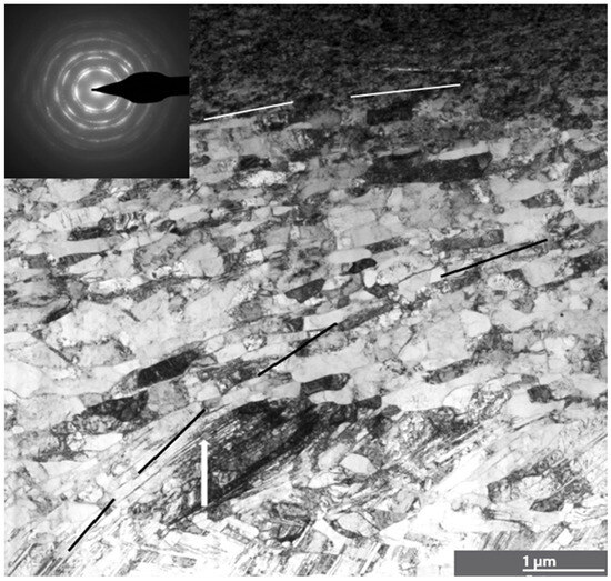 Softening at the macroscale increases with depth, corresponding to decreased stress and strain. Ag’s hardness decreases significantly with deformation depth during friction [86,87]. At the mesoscale, grain width varies from 0.1 μm to more than 10 μm, with an average length-to-width ratio of about 3. The twins disappear from the ASB microstructure, although some twin bands can still be seen at minimal deformation in the bottom part of the TEM image (indicated by an arrow). The corresponding selected-area electron diffraction (SAED) pattern in the inset shows large misorientations between subgrains in most areas. Figure 5 shows a STEM image indicating the strong shearing of surface layers resulting from increased temperature and contact pressure. The arrows demonstrate DRX grains. The pores are clearly seen in the substructure layers. An increasing shear tilt was observed as ASB instability and friction intensified. The initial and final ASB curvatures are shown with lines, and it is expected that the curvature of ASBs is associated with the wear track curvature. The increasing curvature may be related to the reduction in deformation resistance in the dislocation structure of the ASBs (Figure 5). Adiabatic shear bands are shown in Figure 6.