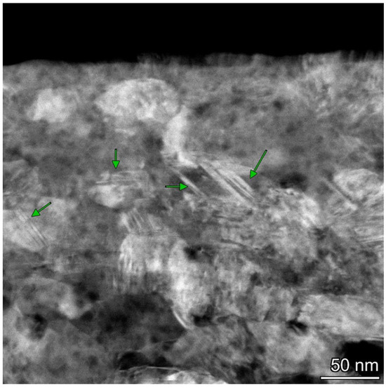 A STEM image of the top surface layers with a large number of deformation twins. The green arrows show the grains with twins.