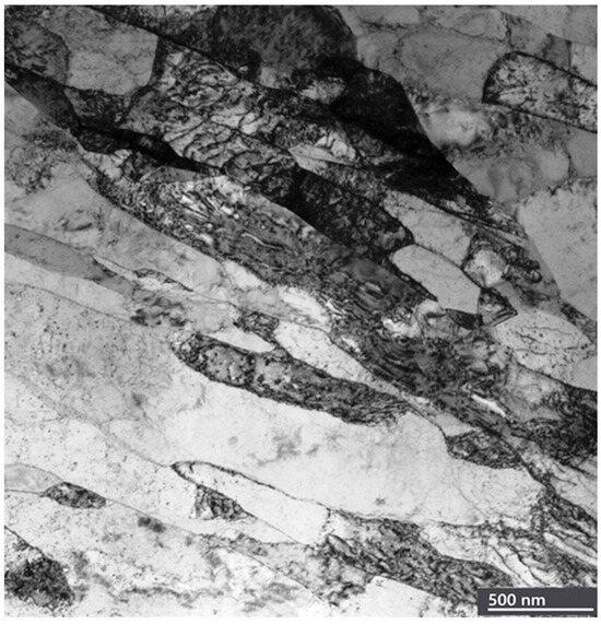 where G is the shear modulus, b is the Burger’s vector, and K* is a fitting parameter, with K* = 6 GPa for Cu [19]. The stress for twin formation in Ag is calculated to be σtw = 846 MPa. If the microhardness of Ag’s surface layers after friction is 780 MPa, then the applied stress is approximately 780/3 = 260 MPa, significantly lower than what Meyers’ model predicts for twin formation. However, a more realistic value of the critical stress for twin formation in Ag (σtw = 160 MPa) was proposed by Zhu et al. [101]. Given that σap > σtw, these results are more consistent with the actual findings. The discrepancy in the calculated parameters may also stem from the complexity of determining the fitting parameter K*. We believe that twin generation is a more complex phenomenon than the K* value used. In our view, the grain boundaries of Ag with low SFE serve as primary dislocation sources. The microstructure of Ag’s top surface layers after steady-state friction, characterized by the formation of a significant volume fraction of twin bundles, intersecting twins, and dislocations, is shown in Figure 3.
