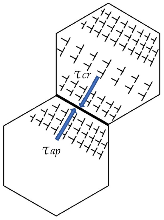 The model of the interaction between the structural elements when the applied stress (τap) associated with the external loading opposes the deformation resistance (τcr) of the internal dislocation structure. The blue arrow, τap, indicates the effect of the external applied shear stress. The blue arrow, τcr, shows internal shear stress associated with deformation resistance to applied stress.