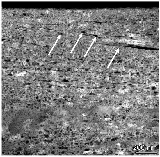 A TEM bright-field image of strong shearing of surface layers resulting from increased temperature and contact pressure. The white and black lines demonstrate strong shearing of ASBs under friction in an unstable state. The twins are shown by the arrow.