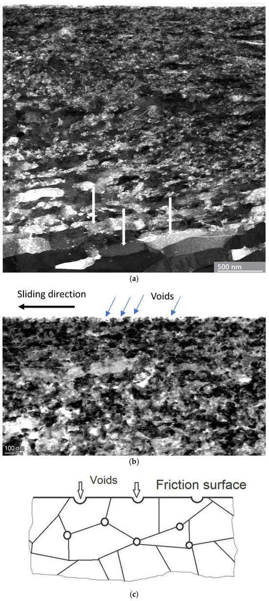 In this Introduction, we will briefly consider the main trends in the study of the deformed structure surface layers under friction in the steady state and the transition to unstable friction. As such, thermo-mechanical and structural analyses of contact interaction will be evaluated. Recently, the mechanical properties of surface layers were improved by the development of gradient nanocrystalline layers [1]. A stable gradient nanograined surface layer significantly reduces the coefficient of friction (COF) of a Cu alloy under high-load dry sliding [2]. Subsequent studies showed that grain refinement occurs after several sliding passes during the running-in of Cu [3]. The dominant mechanisms in the steady friction state are the hardening and softening of surface layers [4]. Moreover, dynamic plastic deformation at cryogenic temperatures was studied [5]. The dislocation manipulation and rearrangement, deformation twinning forming, nanoscale twin/matrix (T/M) lamellae in bundles, and shear banding were identified as dominant mechanisms of DPD. Plastic deformation via shearing leads to the formation of the ultrafine-grain structure observed in severe plastic deformation processes [6]. Grain boundary (GB) stabilization and ultrahigh hardness can be explained by sliding-induced strain localization and microstructural instabilities [7]. In further developments associated with gradient nanostructures, it was shown that gradient nanostructured surface layers of steel exhibit low COFs and enhanced wear resistance [8]. The enhancement of wear resistance was attributed to the high strain accommodation capacity and high hardness of the material. A relatively new method for improving strength and ductility is the creation of heterogeneous nanostructures in metals [9]. High entropy alloys exhibit the synergistic effects of multiscale precipitates, improve resistance to shear deformation, and facilitate the formation of a dense, stable oxide film that effectively decreases wear damage [10,11].