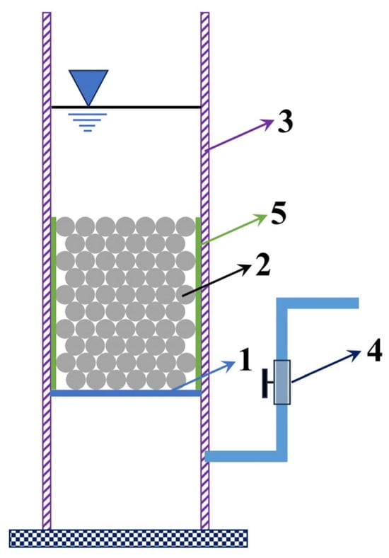 Schematic diagram of the falling head permeability test apparatus. 1: Filter mesh (also supporting the specimen), 2: Specimen, 3: Cylindrical wall (plexiglass), 4: Water stop valve, 5: Plastic wrap layer (ensuring tight contact between specimen and wall to prevent side leakage).