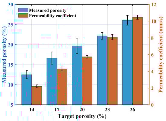 Figure 2 illustrates the effect of target porosity on permeability: both the permeability coefficient and the measured porosity of pervious concrete increase with increasing target porosity. The measured porosities for groups TP1–TP5 were 12.50%, 16.63%, 19.66%, 22.18%, and 26.05%, respectively, closely matching the designed target porosities. This confirms the applicability of the volumetric method for pervious concrete mix design. However, target porosity values were consistently higher than the measured porosity. This discrepancy arises because the measured porosity excludes closed and semi-connected pores present within the concrete [34]. Additionally, achieving absolute compaction between cement paste and aggregates during preparation is difficult, resulting in the measured porosity being lower than the target value.