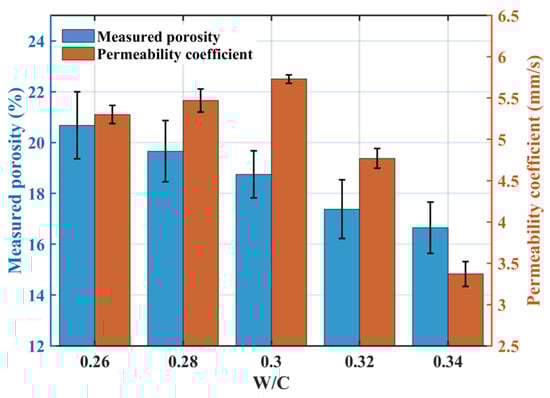 Figure 4 illustrates the effect of the w/c ratio on permeability: the measured porosity decreased with increasing w/c ratio, while the permeability coefficient initially increased and then decreased, peaking at a w/c ratio of 0.30 (5.7 mm·s−1). When the w/c ratio exceeded 0.30, increased paste fluidity led to downward sedimentation during mixing, causing a rapid decline in the permeability coefficient.
