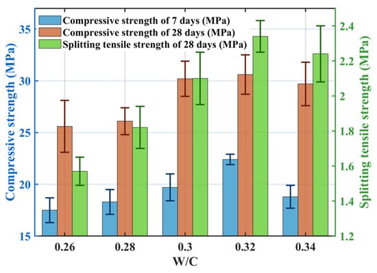 Figure 5 shows the effect of the w/c ratio on mechanical properties: both compressive and splitting tensile strengths initially increased within the w/c range of 0.26–0.32, reaching maximum values at a w/c ratio of 0.32. At this ratio, the compressive strengths at 7-days and 28-days were 22.4 MPa and 30.6 MPa, respectively, and the splitting tensile strength was 2.34 MPa. When the w/c ratio was too low (<0.32), insufficient water hindered complete cement hydration, limiting C-S-H gel formation [37]; unhydrated cement particles contributed little strength. Furthermore, low paste fluidity and high static yield stress hindered mixing, resulting in uneven aggregate coating and poor bonding [13]. At the optimal w/c ratio of 0.32, static yield stress decreased, paste fluidity increased, and mixture workability improved, facilitating uniform paste coating on aggregates and strong bonding. Concurrently, internal void distribution became more uniform, strengthening weaker zones. When the w/c ratio exceeded 0.32, although cement particles might hydrate fully, increased paste fluidity drastically reduced plastic viscosity and static yield stress. This caused paste sedimentation in the upper part of the specimens, uneven internal paste distribution, insufficient paste coating on aggregates, reduced aggregate connectivity, and the formation of large voids and microcracks in the upper sections, ultimately reducing strength.