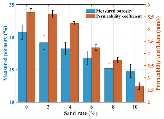 Figure 6 illustrates the effect of sand rate on permeability: both the measured porosity and the permeability coefficient decrease with increasing sand rate. At a sand rate of 10%, the measured porosity was only 14.77%, and the permeability coefficient dropped to 1.85 mm·s−1. This occurs because sand replaces part of the coarse aggregate volume, and its incorporation increases the paste volume, refines internal voids, and improves the density of the interfacial transition zone, thereby reducing permeability.
