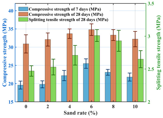 Figure 7 shows the effect of sand rate on mechanical properties: compressive and splitting tensile strengths initially increase and then decrease with increasing sand rate. At a sand rate of 6%, the compressive strengths at 7-days and 28-days increased by 30.7% and 12.6%, respectively, compared to the no-sand mix (SR0), and splitting tensile strength increased by 21.9%. Incorporating a small amount of fine sand to replace part of the coarse aggregate fills voids within the skeletal pore structure of pervious concrete, enhancing the density of the interfacial transition zone and improving overall packing. Simultaneously, a mixed layer of fine sand and cement forms on the coarse aggregate surface, creating a bonding layer between particles that increases concrete stiffness. During mechanical testing, cracks propagating from the surface inward are impeded by the presence of fine sand, requiring greater energy to destroy or bypass these positions, thus improving mechanical properties. However, excessive sand rate (>6%) leads to decreased mechanical performance. Wetting the surface of fine aggregates consumes mixing water. High sand rates increase water demand for wetting, reducing water available for cement hydration. Moreover, fine sand particles, being larger than cement particles, hinder particle movement, reducing the fluidity of the fresh mixture and increasing mixing difficulty [38]. Additionally, high sand rates can lead to insufficient cement paste to fully coat the fine sand surfaces, resulting in a looser mixture with fewer contact points between aggregates, thereby reducing strength.