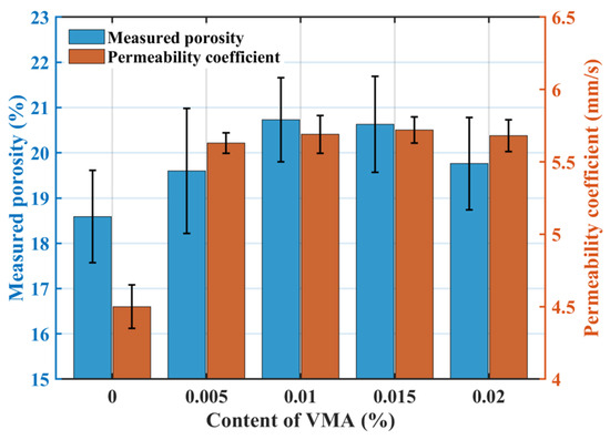 Figure 8 illustrates the effect of VMA dosage on permeability: the measured porosity initially increased slightly and then decreased with increasing VMA dosage, while the permeability coefficient increased initially and then stabilized. The target porosity was 20%, and the measured porosity for the VMA groups fluctuated between 18.64% and 22.8%, consistent with the design. VMA incorporation does not significantly alter the skeletal structure. VMA improves paste workability, preventing sedimentation and blockage, thus increasing permeability at dosages of 0.005% and 0.01%. Further increases in VMA dosage had negligible impact on permeability.