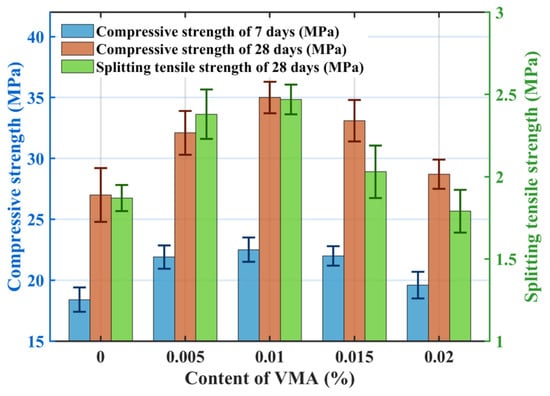 Figure 9 shows the effect of VMA dosage on mechanical properties: both compressive and splitting tensile strengths initially increase and then decrease with increasing VMA dosage. Optimal mechanical performance was achieved at a VMA dosage of 0.01% (VMA3), with compressive strengths at 7-days and 28-days reaching 22.5 MPa and 34.9 MPa, respectively, and splitting tensile strength reaching 2.47 MPa. Strength decreased when VMA dosage exceeded 0.01%, although it remained higher than that of the control group (VMA1). Groups VMA4 and VMA5 exhibited compressive strength at 28-days reductions of 6.1% and 22.0%, respectively, compared to VMA3. Incorporating VMA increases solution viscosity. As dosage increases, the intertwining of VMA and cement paste during mixing alters hydration, increasing paste viscosity and yield stress. This hinders aggregate movement, promoting tight paste coating and bonding after setting. Appropriate VMA optimizes internal pore structure, forming a network bonded to hydration products, densifying the internal structure. Additionally, increased VMA improves mixture workability, enhancing mechanical properties. However, excessive VMA dosage leads to very high paste viscosity, increasing mixing difficulty and causing uneven paste coating on coarse aggregates. Furthermore, the high molecular weight and air-entraining/thickening effects of VMA introduce stable air bubbles that are difficult to expel due to increased viscosity. These bubbles create internal defects within the paste, progressively reducing concrete strength.