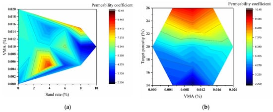 Contour maps of the permeability coefficient: (a) Sand rate vs. VMA dosage; (b) VMA dosage vs. target porosity.