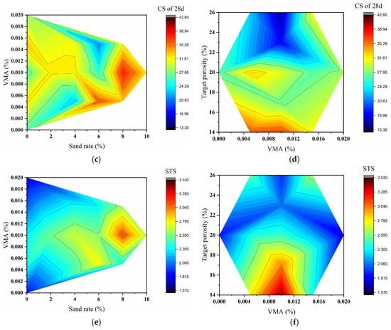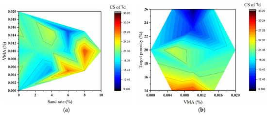 Contour maps (Figure 10) visualized the coupling effects between parameters. Figure 10a shows that high permeability (>8.0 mm·s−1) was achieved at low sand rates (3–5%) and moderate VMA dosages (0.04–0.06%). Beyond 5% sand rate, permeability decreased gradiently due to pore blockage. Figure 10b illustrates that permeability increased markedly once porosity exceeded 22%, while varying VMA dosage had negligible impact—consistent with ANOVA results.