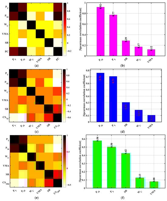 Revealing the correlations between design parameters and material performance is fundamental for mix optimization and understanding performance trends in multi-performance regulation of pervious concrete. This study employed Spearman’s rank correlation coefficient (SCC) to systematically quantify the correlations between key design factors—porosity (design PT and measured PM), water–cement (w/c) ratio, sand rate (SR), and VMA dosage—and major performance indicators: permeability coefficient (PC), compressive strength at 7-days (CS7d), compressive strength at 28-days (CS28d), and splitting tensile strength (STS). The analysis aimed to preliminarily identify factors with significant positive or negative regulatory effects on target performance, providing a basis for variable selection in predictive modeling.