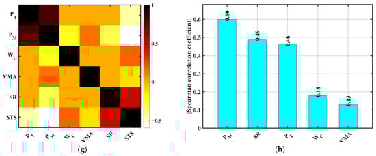 Spearman rank correlation coefficient matrices. (a,c,e,g) Correlation with design porosity (PT); (b,d,f,h) Correlation with measured porosity (PM). (a,b) Permeability coefficient (PC); (c,d) 7 d Compressive strength (CS7d); (e,f) 28 d Compressive strength (CS28d); (g,h) Splitting tensile strength (STS).