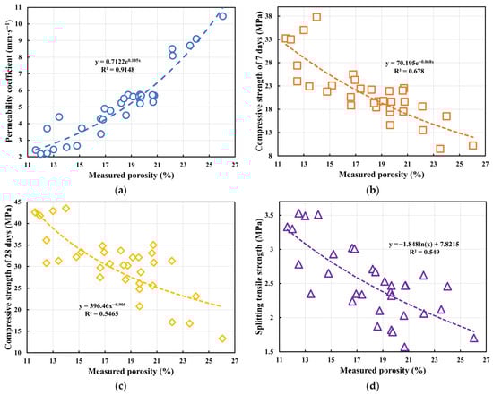 Fitted correlation relationships between the measured porosity and performance: (a) Permeability coefficient (PC); (b) 7-day compressive strength (CS7d); (c) 28-day compressive strength (CS28d); (d) Splitting tensile strength (STS).