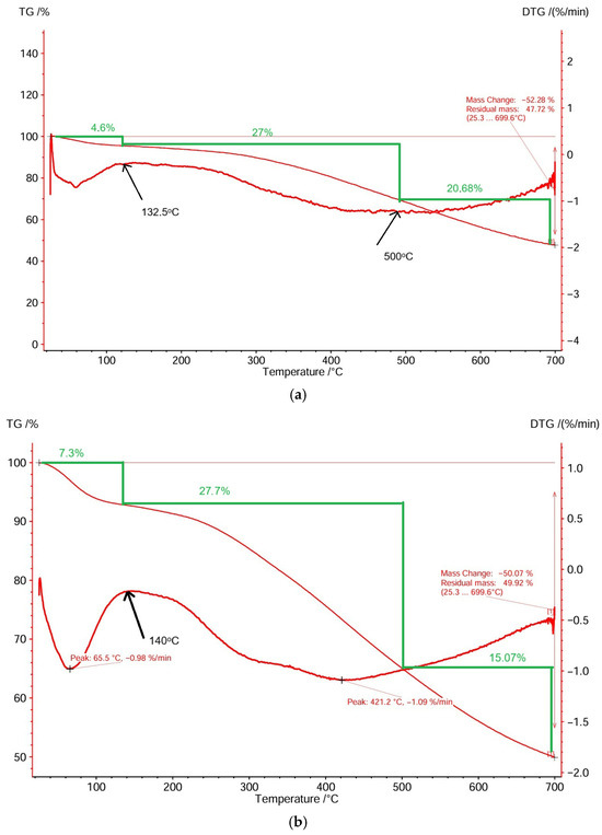 The thermal behavior of the sorbents was studied using TG-DTG analyses. The total mass loss for peach kernel-derived biochar was 52.28% at 699.6 °C (Figure 1a), while grape pit-derived biochar had a total mass loss of 50.07% at 699.6 °C (Figure 1b). DTG graphs indicate that the decomposition of sorbents took place in three stages between 35 and 699.6 °C and between 32.5 and 699.6 °C, respectively. The first zone (35–132.5 °C and 32.5–140 °C, respectively) is characterized by an initial mass loss of 4.6% and 7.3%, respectively, corresponding to the evaporation of free water (endothermic peak in the DTG profiles). The main mass loss of 27% and 27.7%, respectively, was recorded during the second temperature interval (132.5–500 °C and 140–500 °C, respectively) and was attributed to the decomposition of less stable hemicellulose at temperatures below 350 °C [34] and cellulose at temperatures below 500 °C [35,36], and initiation of lignin decomposition [37]. The third temperature interval (500–699.6 °C) corresponds to a mass loss of 20.68% and 15.07%, respectively, due to the second-stage decomposition of the more stable polymer lignin [37,38].
