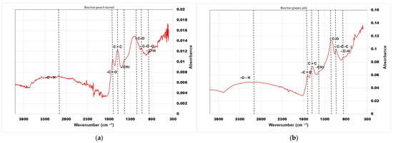 FT-IR results of biosorbents: (a) peach kernel biochar; (b) grape pit biochar.