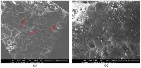 SEM results of biosorbents: (a) peach kernel biochar; (b) grape pit biochar.