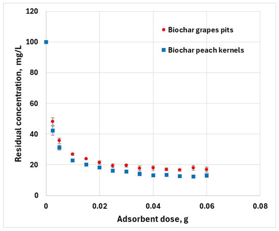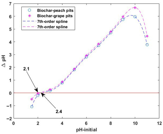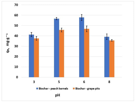 The pH of the point of zero charge (pHPZC) of the tested sorbents was found to be 2.4 for biochar from peach kernels and 2.1 for biochar from grape pits (Figure 4). These values indicate that at a pH less than pHPZC, the biochar surface is positively charged, while at a pH higher than pHPZC, the surface is negatively charged. Thus, at pH values lower than 2.4 and 2.1, respectively, repulsive forces will appear between the positively charged surface of the sorbents and the hexavalent chromium ions. This is not favorable for the sorption process. These results are in agreement with data reported in the literature for biochar sorbents [42].