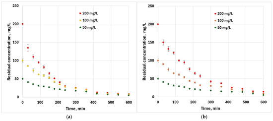 Batch experiments were performed with synthetic solutions that contain hexavalent chromium in the concentration ranges specific to those found in plating wastewater. A volume of 50 mL of Cr6+ solution at the initial concentration C0 was mixed with various weights of biochar. The mixture was stirred at 200 rpm for a predetermined amount of time with a magnetic stirrer and placed in a thermostatic enclosure at 25 °C. Solutions of 0.1 M NaOH and 0.1 M HCl were used for pH adjustment. Kinetic experiments were made by taking a small volume of clear solution (0.1 mL) at regular intervals and determining the residual Cr6+ concentration. The method used for Cr6+ quantification consisted of supernatant analysis by flame atomic absorption spectroscopy (Analytik Jena ContrAA 300, Jena, Germany) at a wavelength of 357.9 nm.