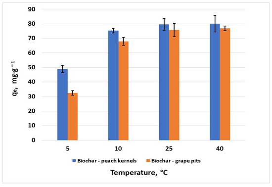 The representation of temperature influence on hexavalent chromium removal (Figure 7) shows a slight increase in the adsorption capacity of both biochars in the range of 25 to 40 °C, with a maximum adsorption capacity of 76.9 mg·g−1 for grape pit biochar and 80 mg·g−1 for peach kernel biochar. This suggests an endothermic adsorption process, which is confirmed by other studies conducted on carbon-based adsorbents [30].