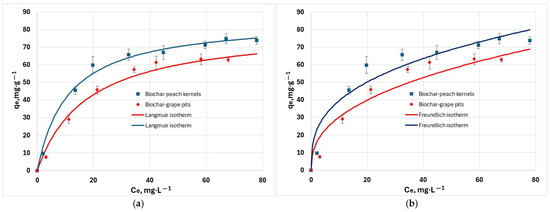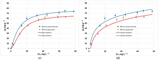 The models usually used to describe the interaction between the sorbent and sorbate, at equilibrium and constant temperature, are Langmuir, Freundlich, Sips, Temkin, and Dubinin–Radushkevich. Reviewing the literature data, it was found that the best agreement between experimental and calculated data for biochar-type sorbents was obtained for chemical adsorption using the Langmuir isotherm and empirical Freundlich isotherm [43,44]. Additionally, Sips and Temkin models have been tested.