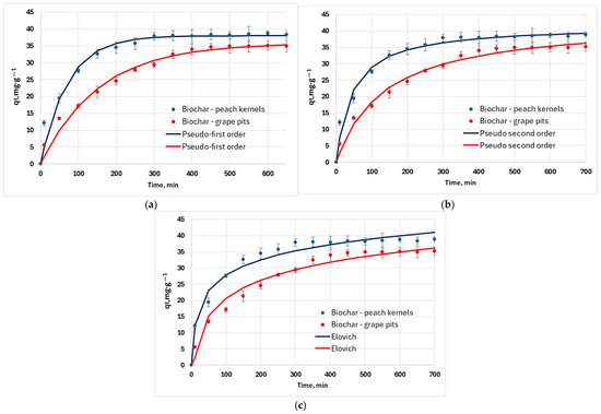 Kinetic experimental data was obtained by the variation of interaction time (Figure 10a). Data was fitted against the pseudo-first-order, pseudo-second-order, and Elovich kinetic models (Figure 10). Determination coefficients for the kinetic models have values above 0.9, indicating a good correlation between experimental and calculated data (Table 5). However, R2 alone is not enough to discriminate between the kinetic models. In the case of both adsorbents, considering the values of RMSE and χ2, the kinetic experimental data match the pseudo-second-order model well (Figure 10b).